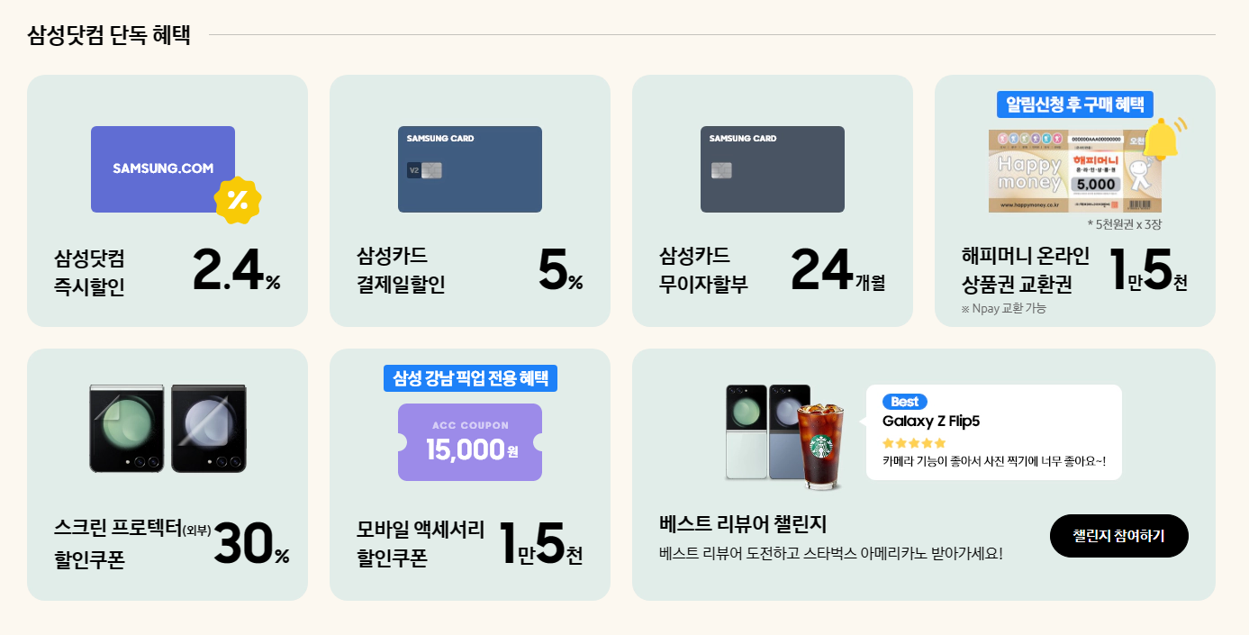 삼성닷컴 단독혜택으로는 삼상닷컴 즉시할인 2.4%, 삼성카드 결제일할인 5%, 삼성카드 무이자할부 24개월, 해피머니 온라인 상품권 교환권 1만 5천, 스크린 프로텍터(외부) 30% 할인쿠폰, 모바일 액세서리 1만 5천 할인쿠폰(삼성 강남 픽업 전용 혜택)이 있습니다.