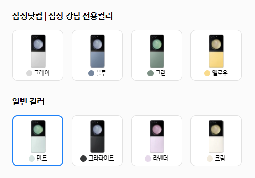 갤럭시 z플립 5 색상은 민트, 그라파이트, 크림, 라벤더 4가지 색상으로 출시하였고, 삼성 닷컴과 삼성 강남에서만 만날 수 있는 스페셜 색상은 그레이, 블로, 그린, 옐로 4가지가 있습니다.