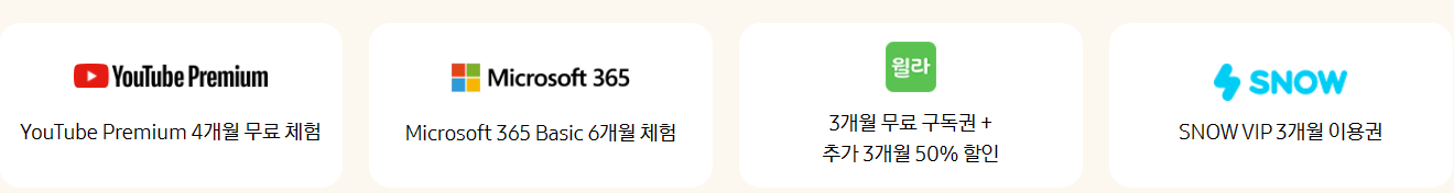 또, 유튜브프리미엄 4개월 무료체험, 마이크로소프트 365 베이식 6개월 체험, 윌라 3개월 무료 구독권+추가 3개월 50% 할인, 스노어플 VIP 3개월 이용권 혜택도 있습니다.