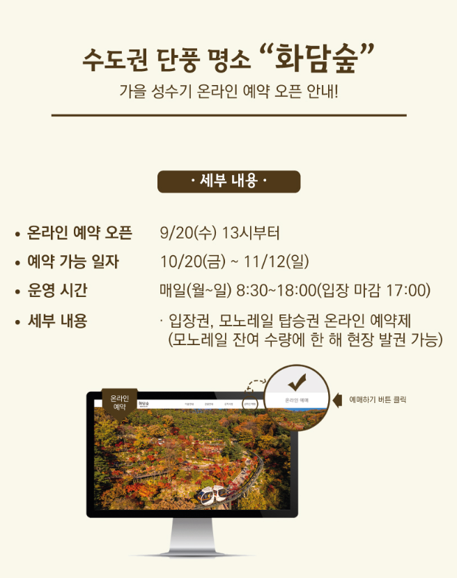 - 화담숲 가을 단풍 축제 입장권 예매방법: 입장권(필수예매) → 모노레일(선택예매) → 온라인 예매완료 → 이용당일 화담숲 입고, 모노레일 탑승장에서 QR코드 제시 후 입장