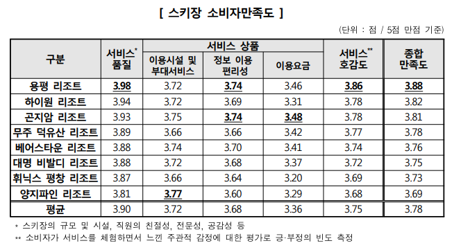2018년 기준, 한국소비자원은 소비자선호도가 높은 8개 업체의 스키장에 대한 소비자만족도 및 이용행태를 분석했습니다. 소비자 만족도는 스키장 이용자 1,200명을 대상으로 서비스품질, 서비스상품, 서비스 호감도 3 부문으로 나누어서 평가했습니다. 이용시설 및 부대서비스 만족도(평균 3.72점)는 높고, 이용요금 만족도(평균 3.36점)는 낮은 결과가 나왔습니다.