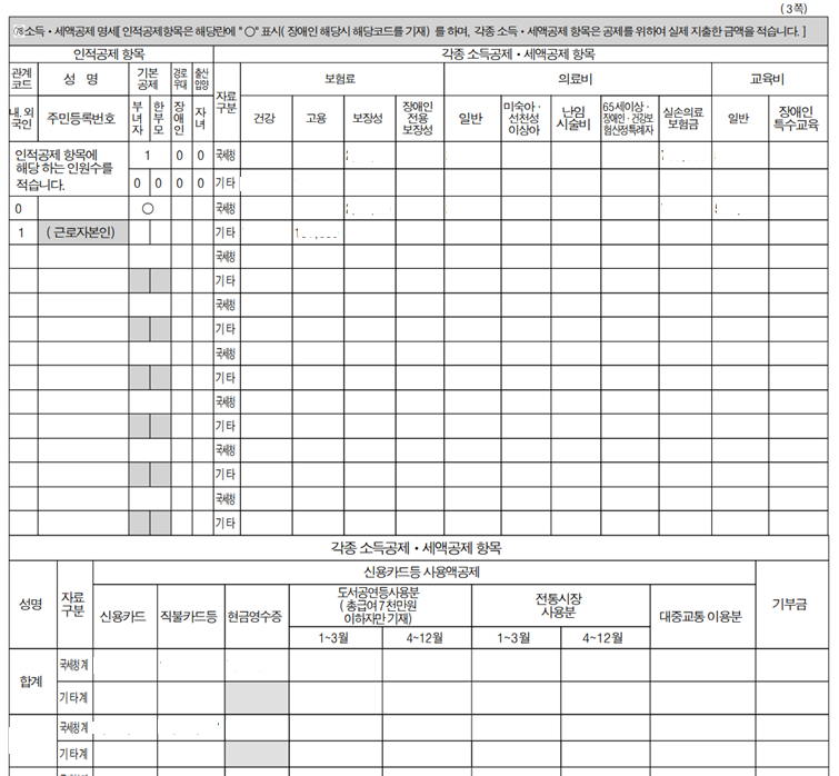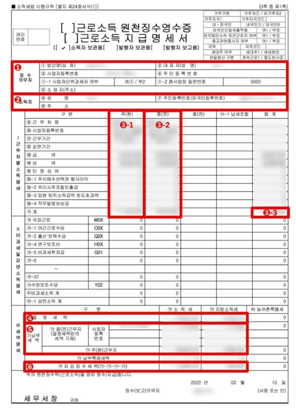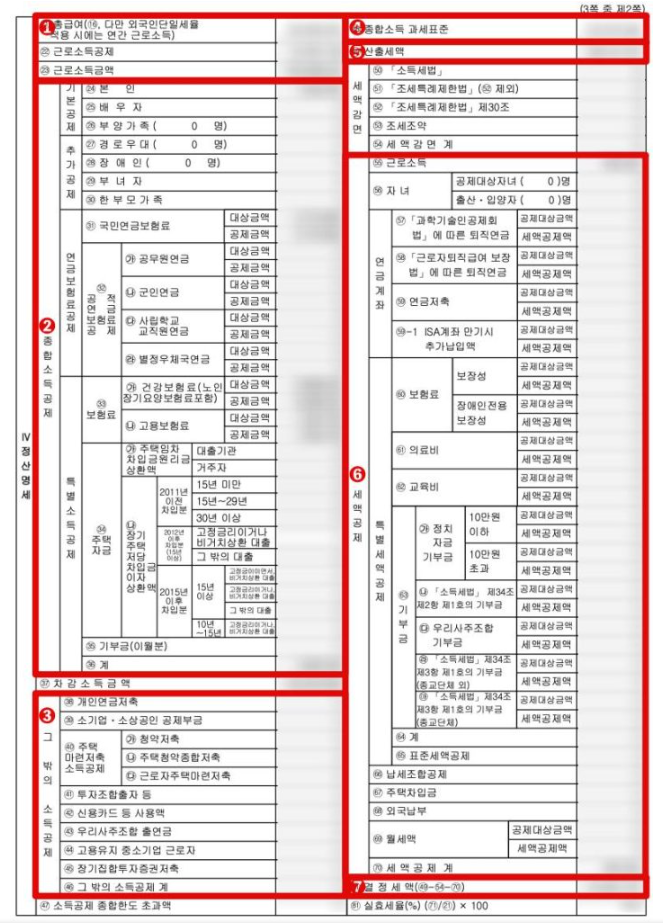 - 근무처별소득명세서: 1년 동안 이직했다면 현재 근무지(3-1) 외 종전 근무지(3-2)의 소득이 기록되고 총소득(3-3)이 계산되어 함께 표기