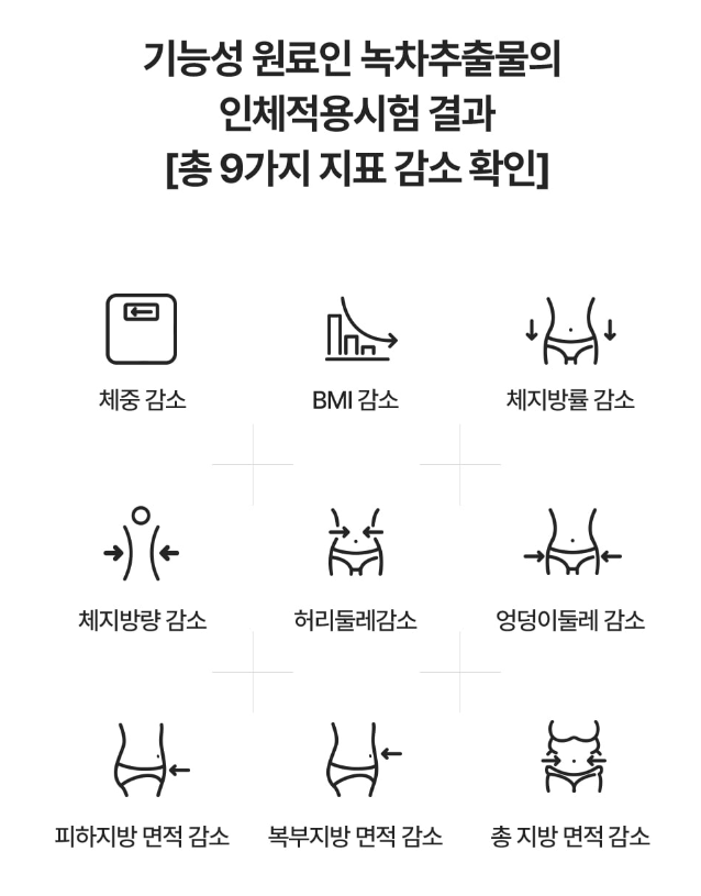 - 3중 기능성 녹차카테킨 400mg: 체지방감소, 항산화, 혈중 콜레스테롤 개선