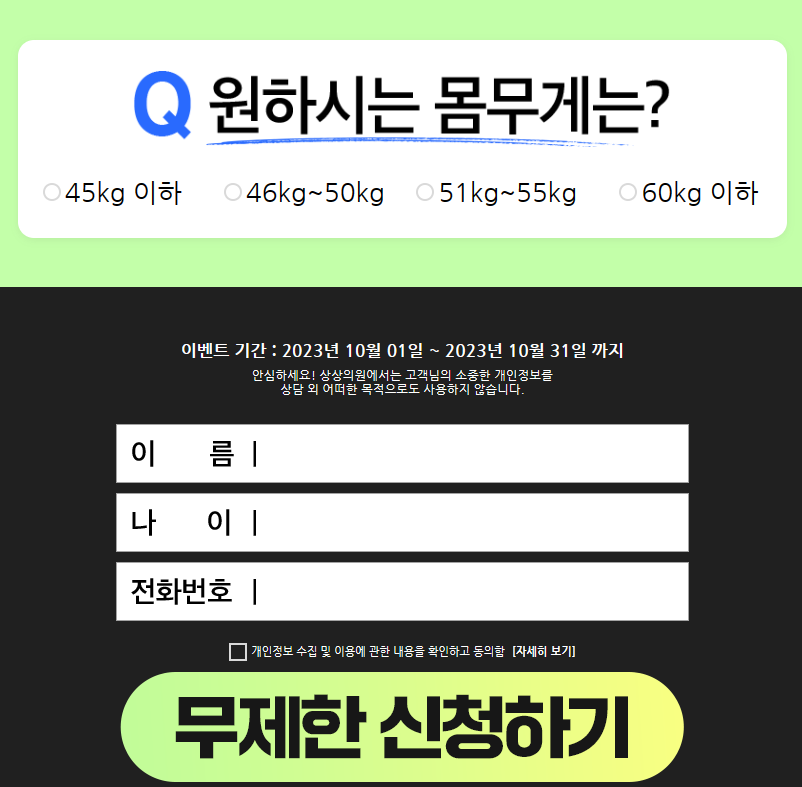 설문조사에 참여하면, 혜택도 드리고 있으니 이 기회 놓치지 말고 서두르시기 바랍니다. 상상에서 만드는 나만의 워너비 라인. 팔라인,복부라인,허벅지라인 모두 내가 원하는 핏으로 만들어보세요. 이벤트기간은 2023년 10월 01일~ 2023년 10월 31일까지입니다.