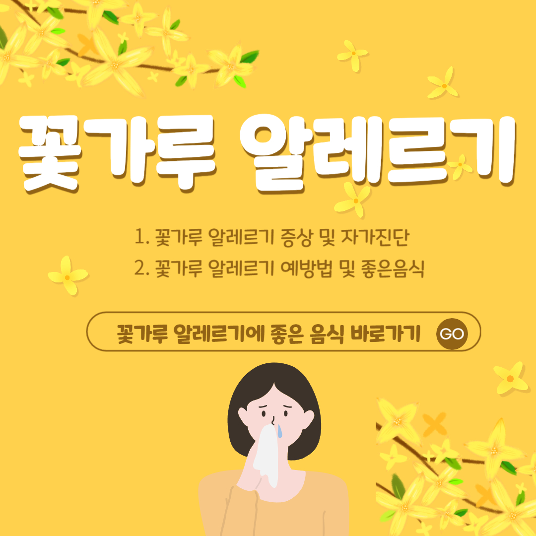 요즘 꽃가루가 많이 날려 꽃가루 알레르기로 불편하신 분들 많이 계시죠? 꽃가루 알레르기는 꽃가루를 코를 통해 들이마실 때 발생하는 알레르기성 호흡기 질환을 말합니다. 연속적으로 재채기, 코막힘, 가려움증, 맑은 콧물의 4가지 주요 증상이 특징인데요. 꽃가루 알레르기 증상(자가진단)과 예방법 및 좋은 음식에 대해서 알아보도록 하겠습니다.
