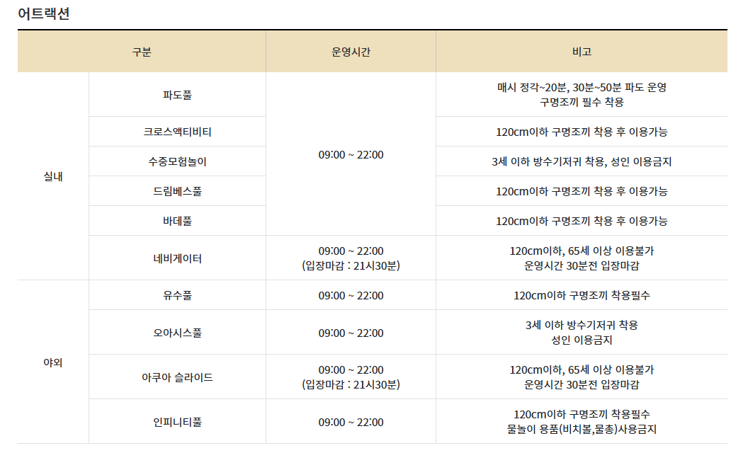 - 물놀이는 체력 소모가 크므로 50분 이용후 반드시 10분 휴식을 취하시기 바랍니다.