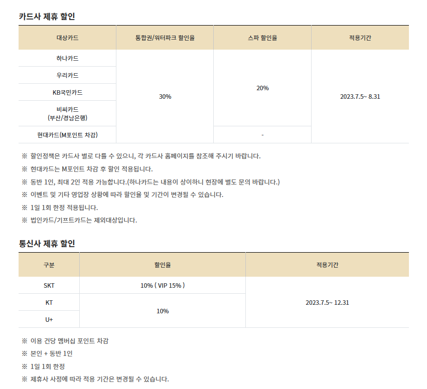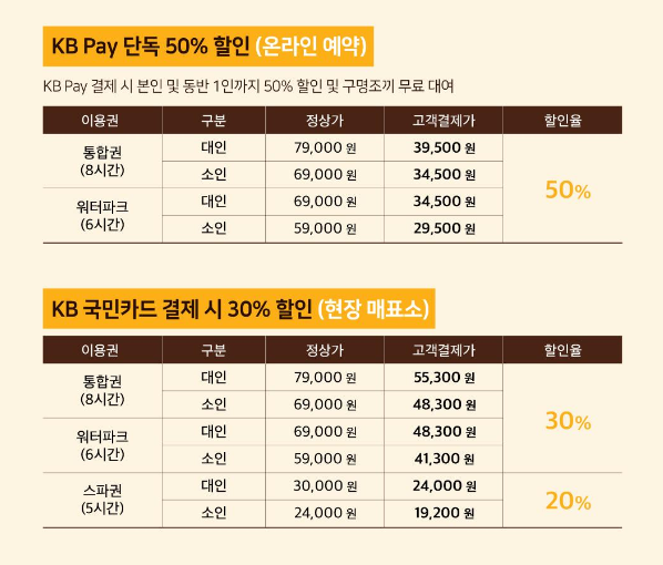 KB Pay로 결제 시 최대 2인 50%할인됩니다. KB Pay로 결제시 구명조끼 대여 무료, 통합권, 워터파크권 50% 할인(스파권 제외)