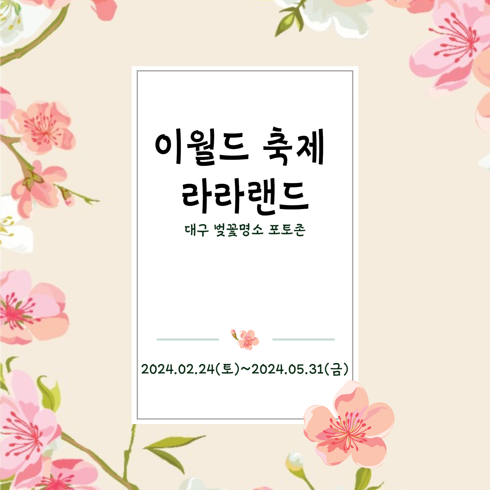 지금까지 대구 이월드 라라랜드 축제에 대해서 알아보았는데요. 이월드 라라랜드는 2024년 2월 24일부터 2024년 5월 31일까지 축제가 진행됩니다. 3월 중순부터는 이월드의 오랜 포토 명소인 로맨틱힐과 다이내믹힐이 아름다운 꽃과 조경을 전망할 수 있는 공간으로 새롭게 변화된다고 합니다. 벚꽃부터 대면적 튤립가든으로 이어지는 블라썸 피크닉으로 이월드 라라랜드 가보시는 건 어떨까요?