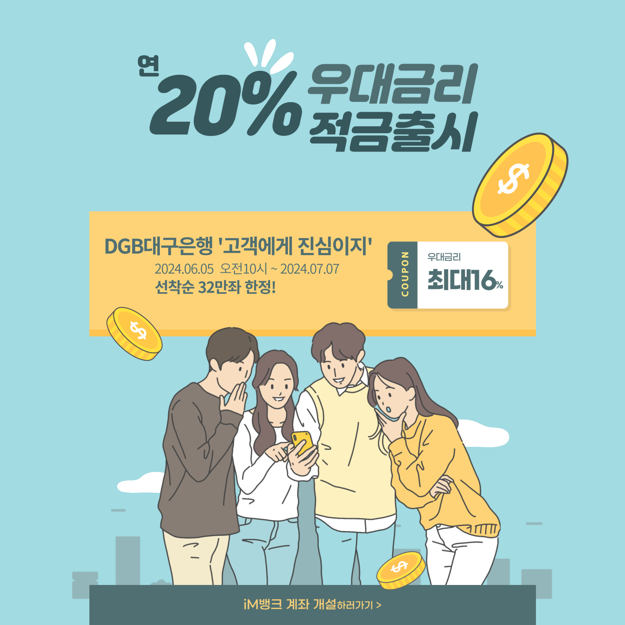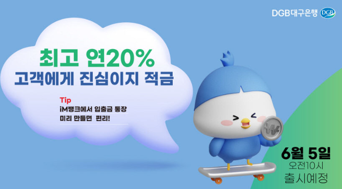 DGB대구은행 고객에게 진심이지 적금은 연 20%짜리 고금리 적금 상품으로 6월 5일 ~ 7월 7일까지 32 만좌 한도로 판매할 예정입니다. 6월 5일 오전 10시부터 iM뱅크 앱에서 가입을 할 수 있고 가입 당일에는 고객이 몰려 앱 이용자가 폭증할 수 있기 때문에 미리 iM뱅크에 가입해서 계좌를 개설해 두는 것을 추천드립니다.