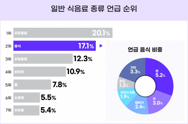 일반 식음료 중에서도 역시 숙취해소 하면 많이들 찾으시는 이온음료가 1위를 차지했습니다. 이온음료 중에서는 숙취 해소 음료로 유명한 포카리스웨트와 파워에이드, 게토레이 순으로 언급이 많았는데요, 특히 포카리스웨트는 사이다나 비타 500, 보리차 등과 섞어 마시거나 비타민과 함께 섭취한다는 등 다른 제품과 섞어 마신다는 내용을 꽤 확인할 수 있었습니다.