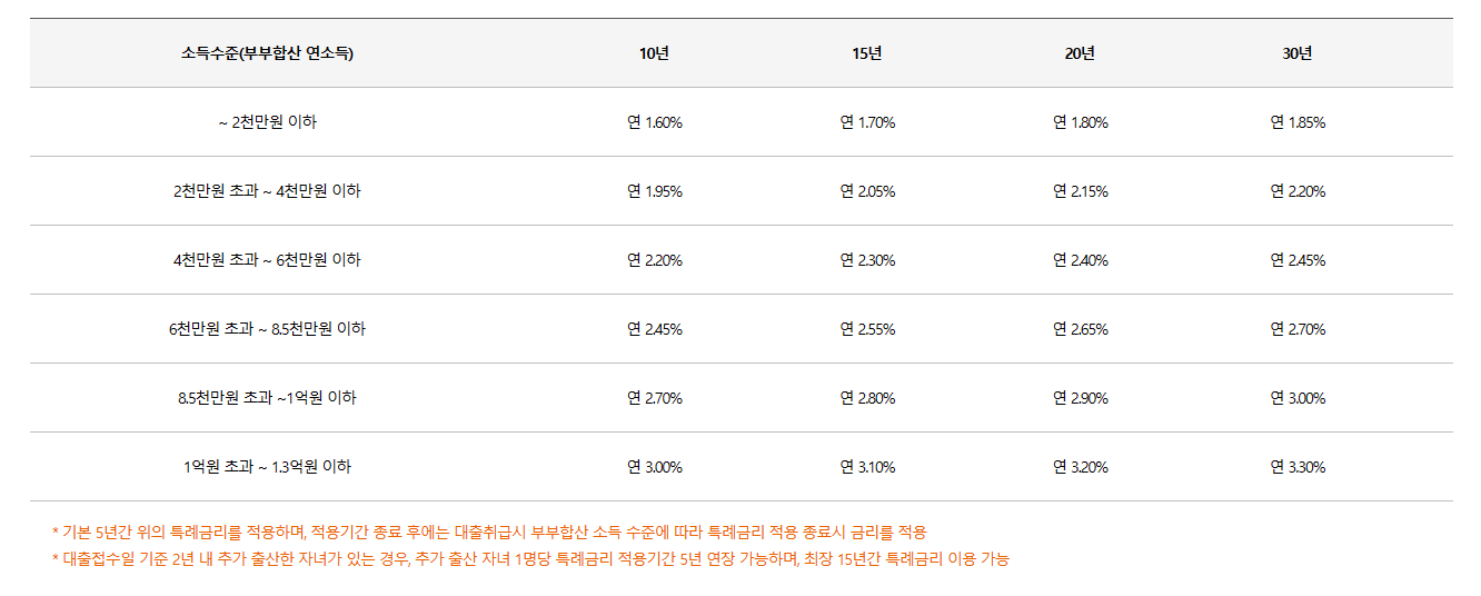 | 대출조건 | - 대출 신청일 기준 2년 내 출산 - 부부합산 연 소득 2억원 이하 - 순자산 4.69억원 이하 - 무주택 세대주 및 1주택자(대환대출) |