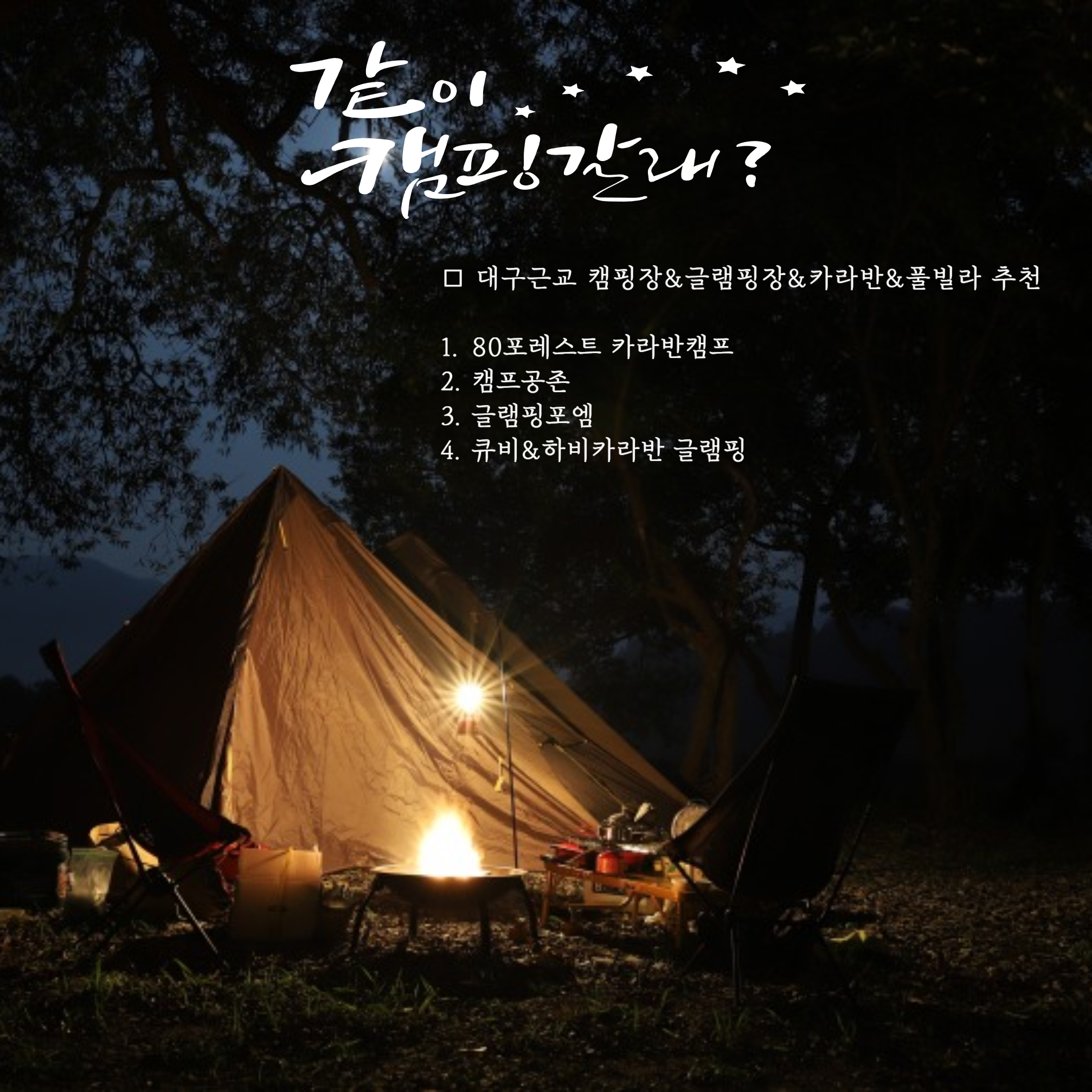 파란 하늘에 선선한 바람을 솔솔 부니 캠핑 생각이 절로 납니다. 가을 하면 캠핑의 계절이라 해도 과언이 아닐 정도죠? 대구근교 글램핑장 BEST4를 소개해드리겠습니다. 캠핑의 계절(시즌)이 시작되어서 그런지 이미 예약마감된 곳이 많으니 서둘러서 예약하시고 좋은 추억 남기시기 바랍니다.