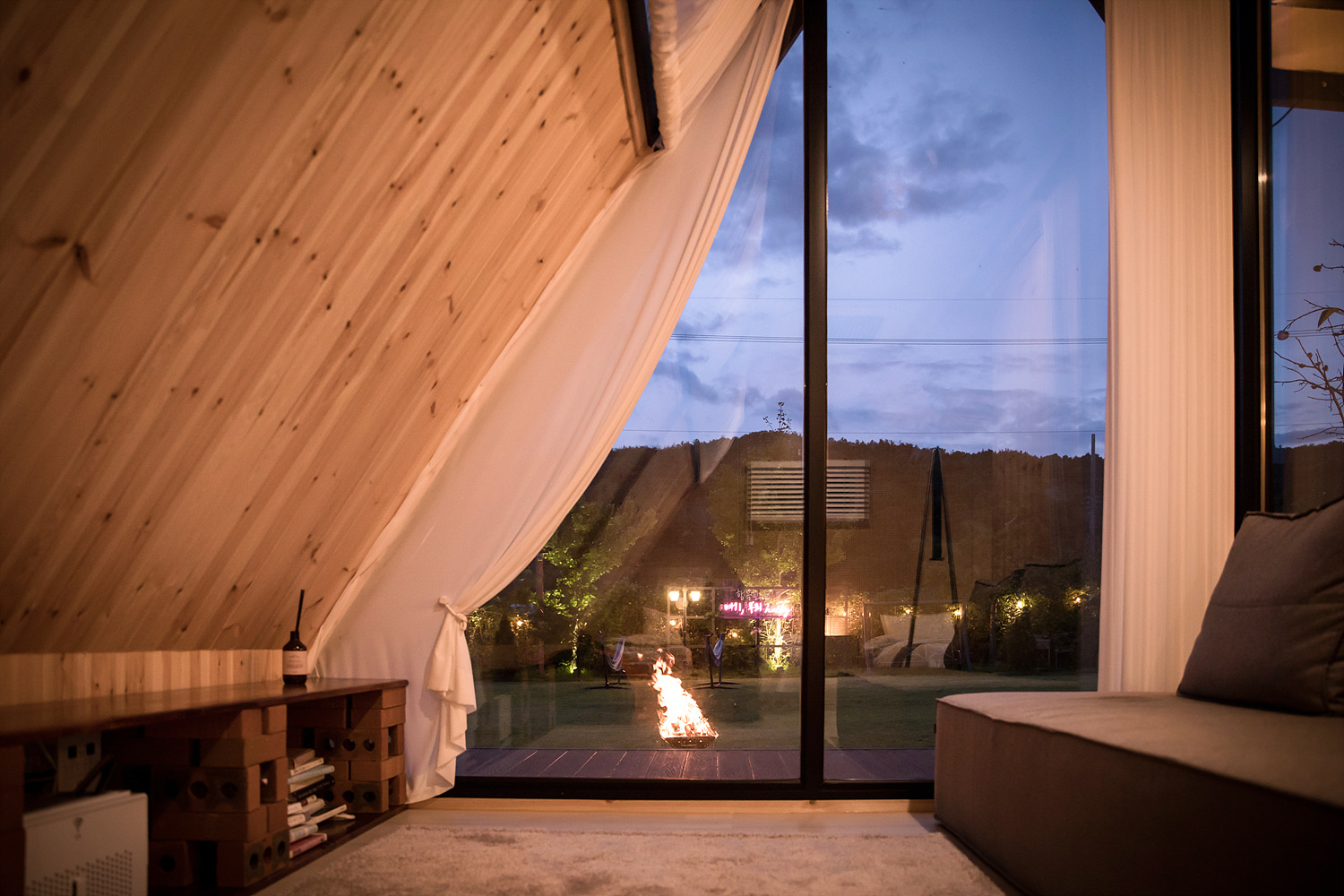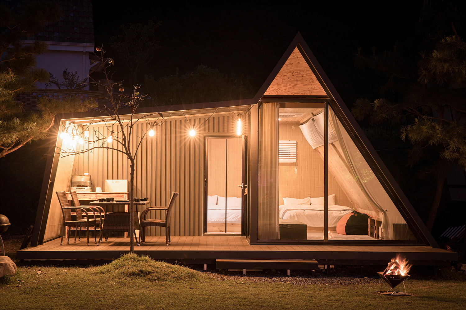 - 이지돔(방갈로): 냉난방기, 미니냉장고 1, 좌식테이블, 야외테이블 + 4인용 파라솔 제공, 불멍사이트