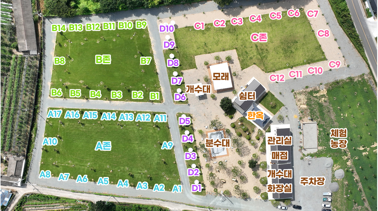 - 캠핑장: 바닥분수, 화이트모래사장, 편의점, 엄마쉼터, (화장실, 개수대, 샤워장: 냉난방기 완비)