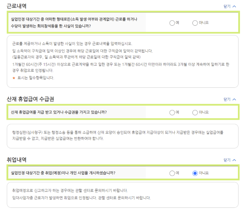 - 실업인정 대상 기간 중 취업(예정)이나 개인 사업을 개시한 경우 체크하고 아래 내용을 확인합니다.