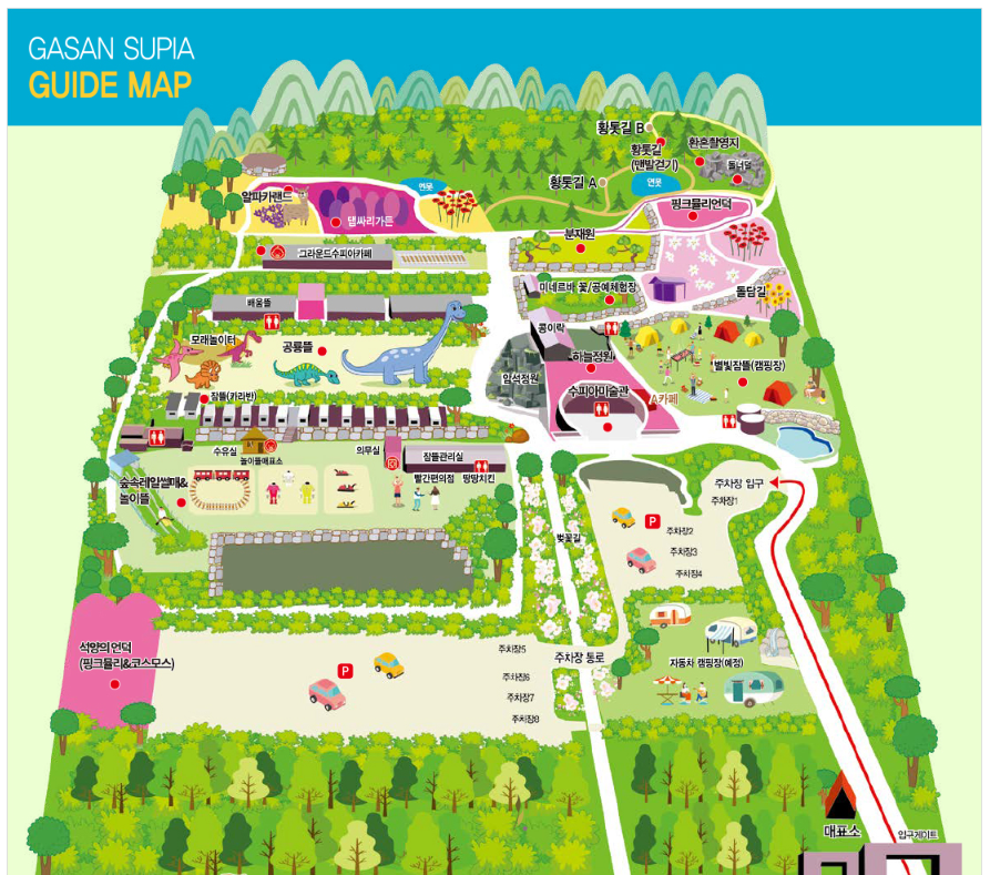 칠곡 가산수피아는 핑크뮬리로드와 핑크뮬리언덕으로 인해 SNS에서 많이 유명해지면서 커플들의 데이트코스로 유명합니다. 캠핑장 같은 경우 다른 캠핑장에 비해 화장실이나 전반적인 관리가 잘되고, 알파카랜드, 숲 속 레일썰매 등 놀거리가 많이 아이와 함께 방문하셔도 좋을 것 같습니다.