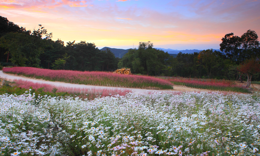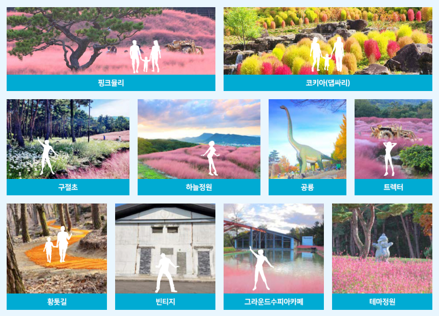 하늘정원> 그라운드카페 핑크뮬리> 댑싸리가든> 황톳길(구절초원)> 핑크뮬리언덕> 석양의 언덕