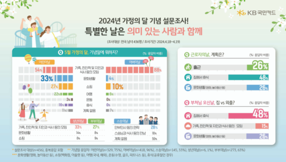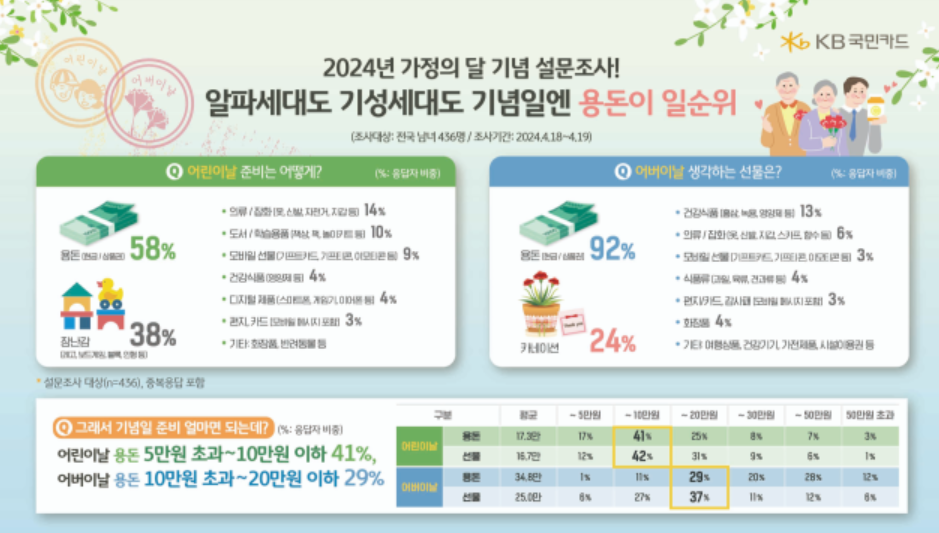 1일 KB국민카드는 가정의 달 5월을 맞아 전국 남녀 436명을 대상으로 지난달 18-19일 진행한 설문조사 결과를 공개했습니다. 어버이날 어린이날 등 5월 주요 기념일을 위해 준비하는 선물 1위는 용돈(현금, 상품권)으로 나타났습니다.