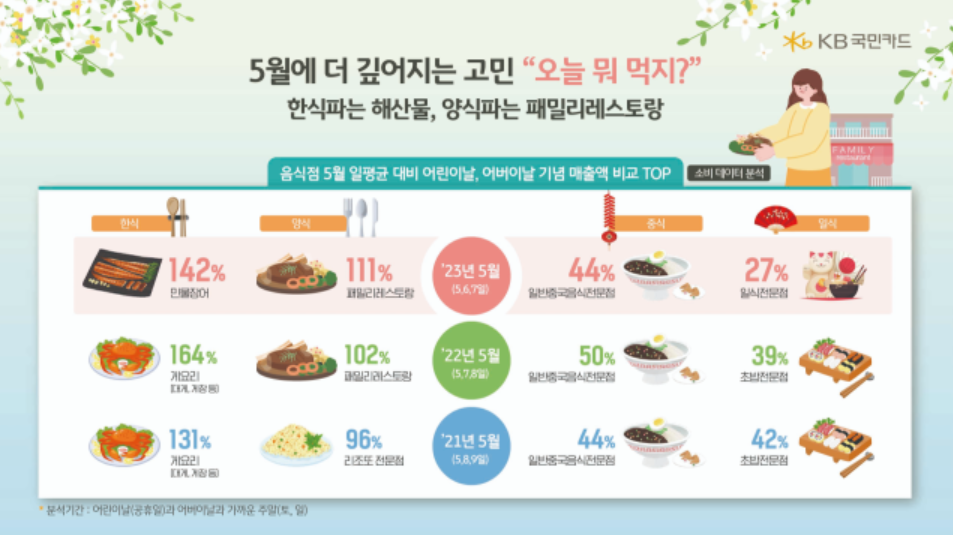 KB국민카드가 지난해 5월 외식 소비를 분석한 결과 어린이날, 어버이날 기념일에 가장 많이 찾는 음식점은 해산물(민물장어) 식당이나 패밀리 레스토랑이었는데요. 지난해의 경우 어린이날과 어버이날에 민물장어집 매출이 5월 일평균 대비 142%가 늘었고, 2022년과 2021년에는 게요리(대게, 게장) 집 매출이 각각 164%, 131% 증가했습니다.