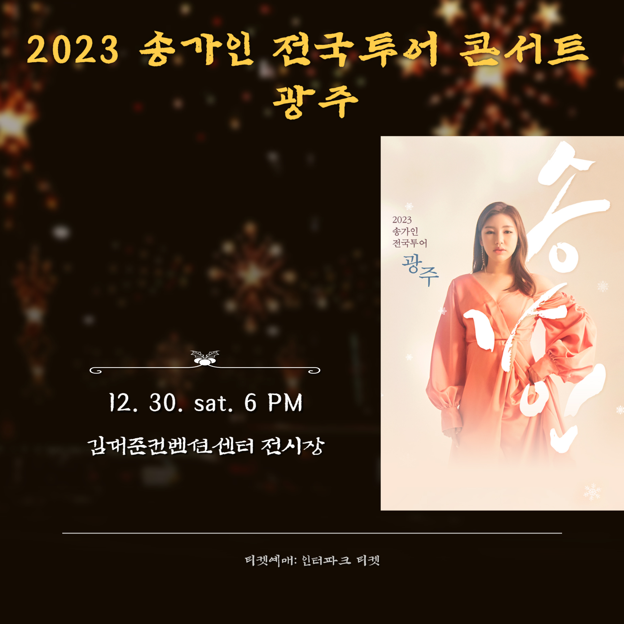 전국투어 콘서트, 티켓오픈과 동시에 1위를 차지한 송가인이 2023년 12월 30일(토)에 콘서트가 진행됩니다. 20대부터 50대까지 고른 연령대의 팬들을 보유하고 있죠. 2023 송가인 전국투어 콘서트는 광주에서부터 시작하여 목포, 수원, 군산, 인천, 서울 등 10개의 지역에서 진행됩니다.