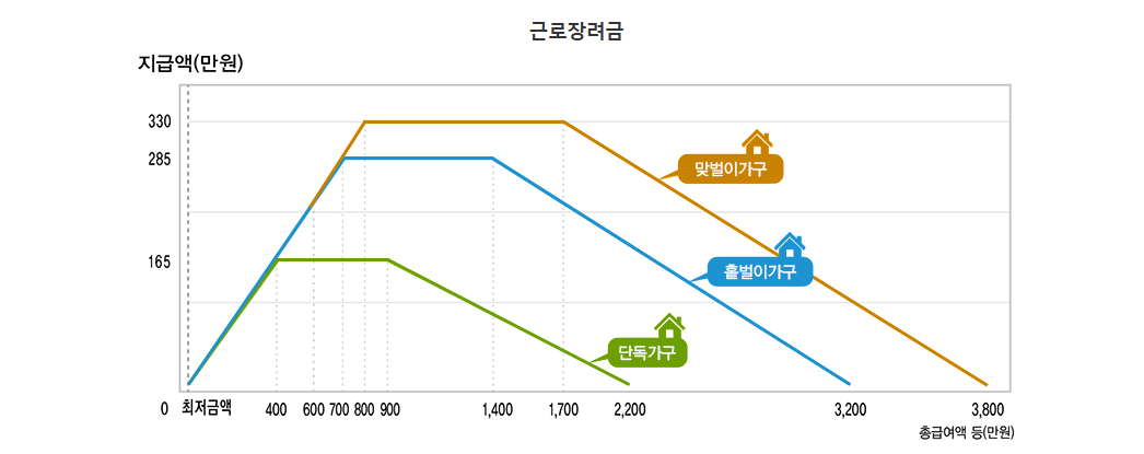 | 맞벌이가구 | 근로장려금 | 600 ~ 3,800만원 | 2 ~ 330만원 |