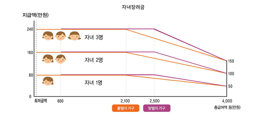 | 자녀장려금 | 4 ~ 4,000만원 | 50 ~ 80만원 (자녀 1인당) |