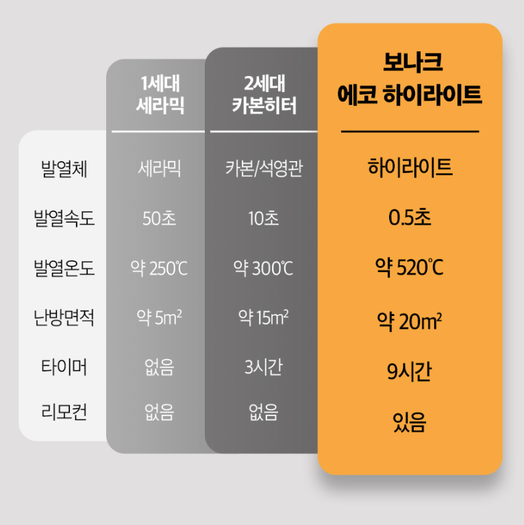 전기요금 걱정 없는 전기히터 추천 BEST3 중 두 번째 제품은 보나크 에코 큐브 하이라이트 히터입니다. 이 제품의 가장 큰 특징은 발열체로 0.5초만에 따스함을 얻을 수 있다는 점입니다. 사용 전력 대비 높은 효율의 발열로 에너지를 저감 할 수 있고 열을 한 곳으로 모아서 먼 곳까지 온기를 전달할 수 있으며 자동으로 작동을 멈추는 인체감지센서를 탑재했습니다.