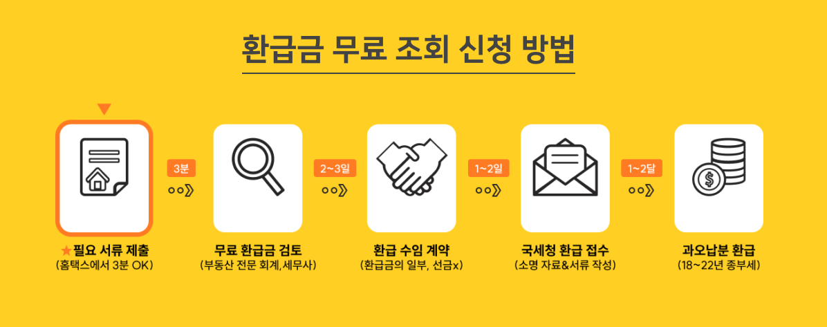 환급금 무료 조회 신청 방법은 필요서류 제출> 무료 환급금 검토> 환급 수임 계약> 국세청 환급 접수> 과오납분 환급입니다. 정확한 환급금 분석을 위해서는 홈택서에서 서류 2개를 제출해야 합니다.