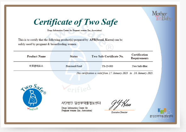 Two Safe란 임산부와 태아의 건강(Two Safe)을 보호한다는 뜻으로, 임산부약물정보센터의 인증 시스템을 통과한 제품에만 적용되는 인증 마크입니다.