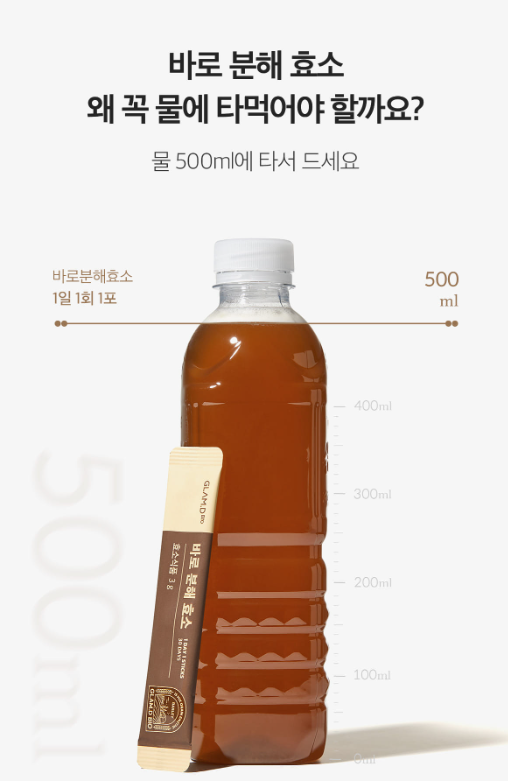 털어먹는 과립형태의 효소는 입에 잔여물이 남아 온전한 흡수가 어렵다고 합니다. 물에 타서 먹는 바로 분해 효소는 우리 몸에 빠르게 흡수되어 바로 배출이 가능합니다. 바로 분해 효소는 카페인이 없고, 효소와 유산균 15곡 곡물이 들어있는 프리미엄영양 밸런스 워터이기 때문에 부담 없이 식수로 대체가 가능합니다.