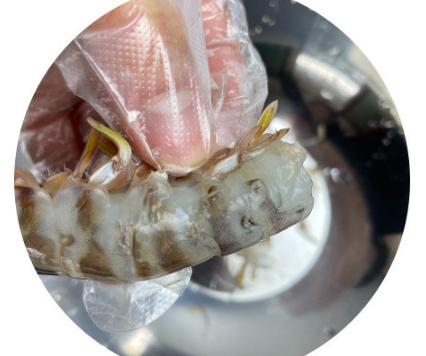 - 몸통 부분을 제거하고 마지막으로 이쑤시개를 이용해 두 번째 마디에 실처럼 생긴 내장을 제거해 주면 완성!