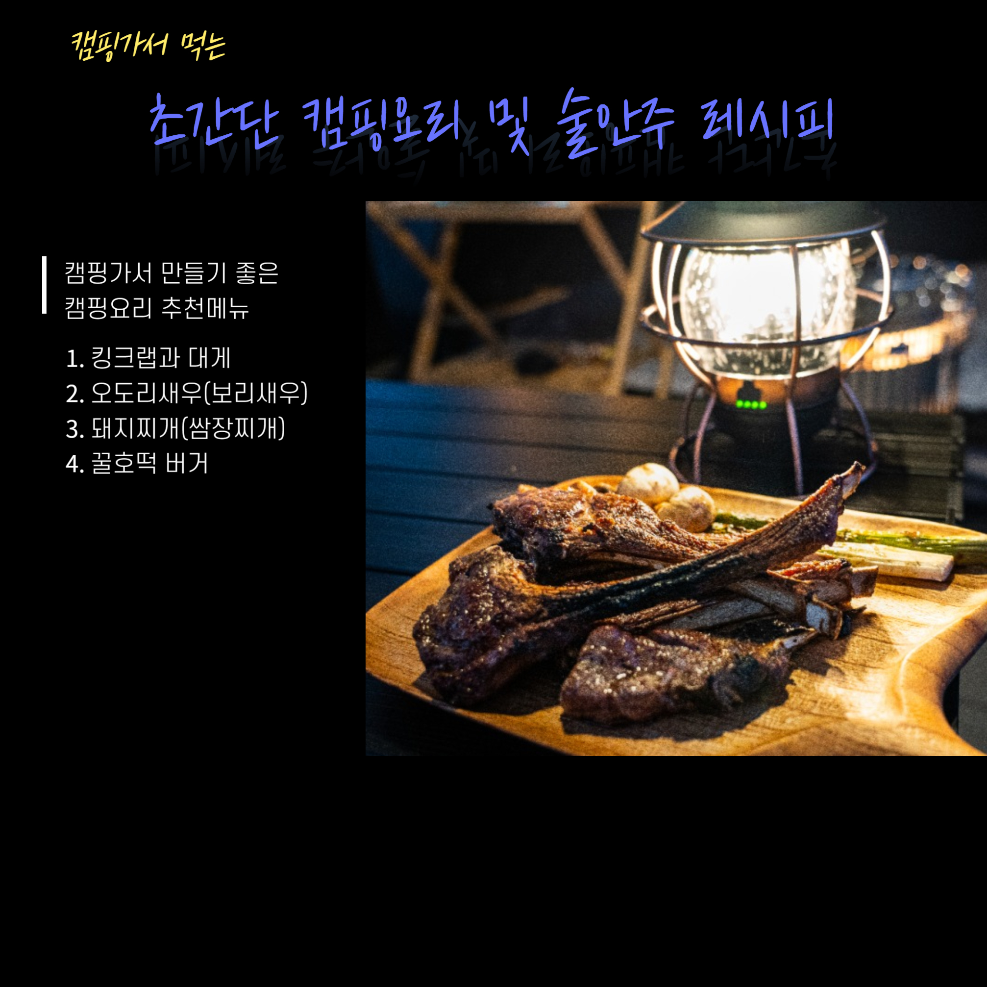 날씨가 선선해지면서 캠핑의 계절이 돌아왔습니다. 캠핑 가서 뭐 먹지?라는 고민이 끊이지 않을 텐데요. 간단한 캠핑요리 및 술안주에 대해서 소개해드릴 테니 가족과 친구와 함께 훌륭한 캠핑요리를 즐겨보시기 바랍니다.