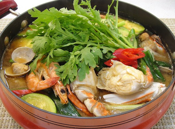 - 게딱지가 붉게 변하면 준비해 둔 애호박, 대파, 청양고추를 넣고 5분 정도 더 끓여 야채들이 익으면 꽃게탕 완성.