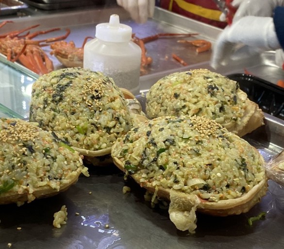 - 내장을 잘 긁어낸 게 껍데기에 볶음밥을 야무지게 넣어주시면 게딱지 볶음밥 완성.