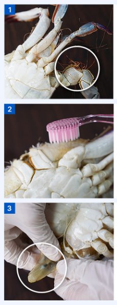 - 칫솔로 껍데기 틈의 찌꺼기를 닦아줍니다. 특히, 다리사이에 이물질이 많기 때문에 칫솔로 박박 문질러서 다리가 떨어지지 않도록 세척합니다.