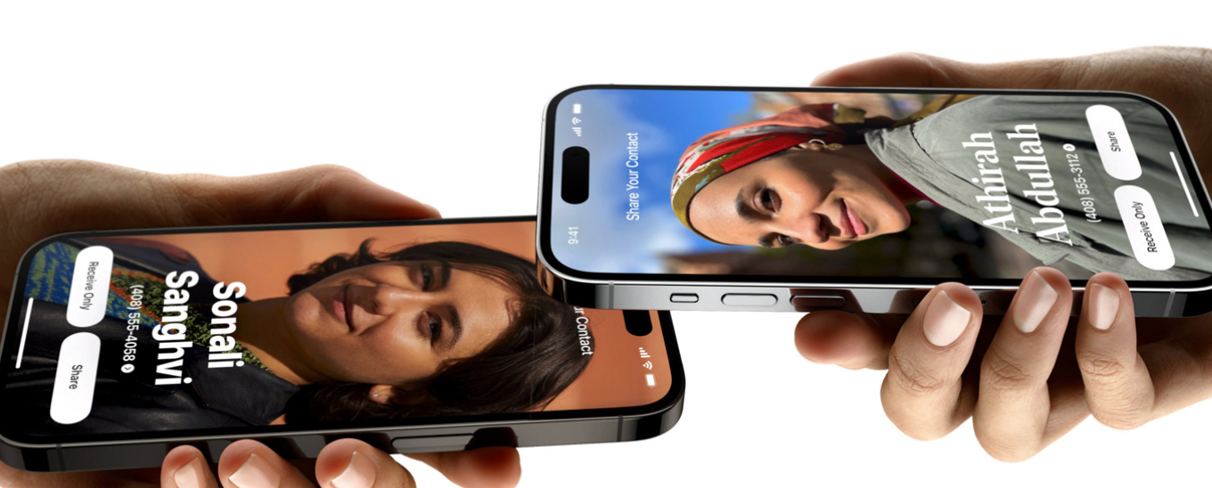 아이폰을 다른 사람의 아이폰이나 애플워치에 가까이 가져가면 NameDrop이 활성화되어 각자 공유하고자 하는 전화번호나 이메일을 직접 선택 후, 연락처 포스터와 함께 바로 공유할 수 있습니다.