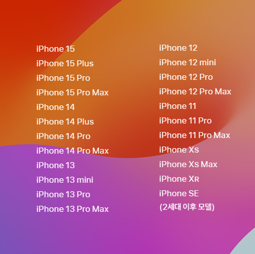 아이폰 iOS 17과 호환되는 기기는 다음과 같습니다. 아이폰 SE 2세대 이후 모델부터 지원하오니 참고하시기 바랍니다.