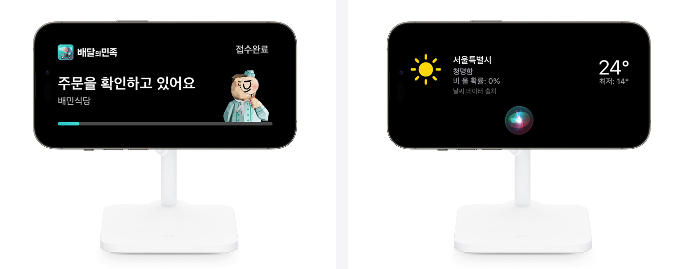 충전 중인 아이폰을 가로로 돌리면, 내려놓은 상태로 더욱 쓰임새 있게 활용할 수 있습니다. 실시간 현황을 전체 화면에서 편리하게 확인할 수 있고, Siri 요청 결과가 큼직하게 표시되어 조금 떨어진 거리에서도 눈에 쏙 들어와 핸즈프리로 날씨를 확인하거나 타이머를 설정하는 일 등이 간편해졌습니다.