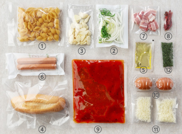 마늘, 양파, 파를 포함해 올리브오일과 건고추, 베이컨 소시지, 눈꽃치즈와 파슬리, 수란형태의 달걀, 토마토소스 그리고 바게트빵과 콘킬리에면으로 구성되어 있어 20분 만에 후다닥 만들 수 있는 크리스마스 연말 홈파티 음식입니다.