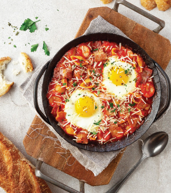 토마토소스 베이스 위에 수란을 얹어 바삭한 바게트와 함께 곁들여 먹는 에그인헬은 비주얼이 마치 지옥불 속의 달걀 같아 에그인 헬이라고도 불립니다. 에그인헬은 크리스마스 연말 홈파티에서 빠질 수 없는 음식이기도 하죠.