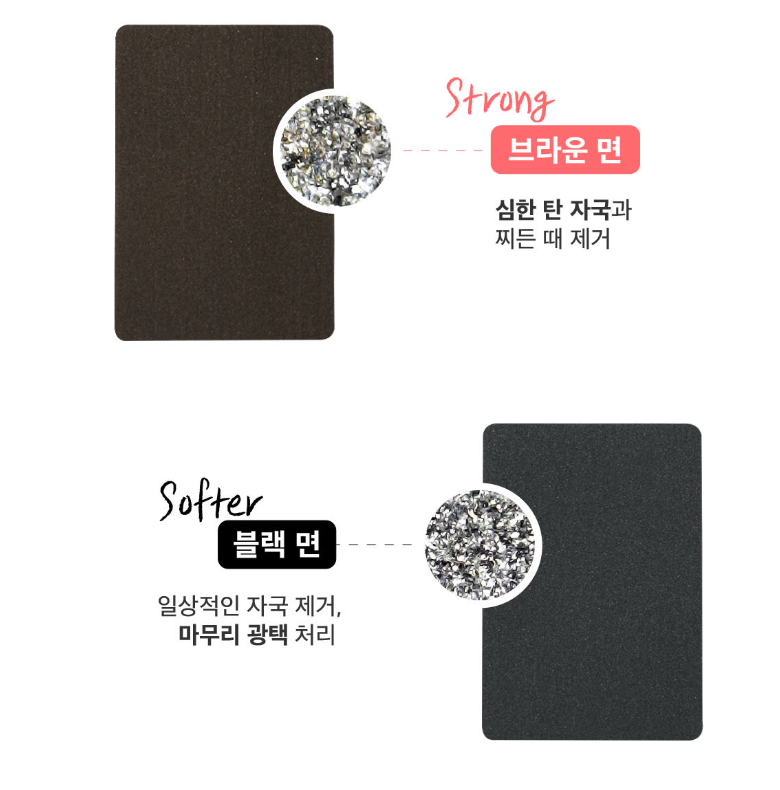 매직 탄세미는 탄 자국, 찌든 때를 간편하게 제거할 수 있고, 탄 자국, 찌든 때의 정도에 따라 양면을 골라 사용할 수 있습니다. 브라운면은 심한 탄 자국과 찌든 때를 제거하는 데에 사용하면 되고, 블랙면은 일상적인 자국제거와 마무리 광택처리에 사용하면 됩니다.