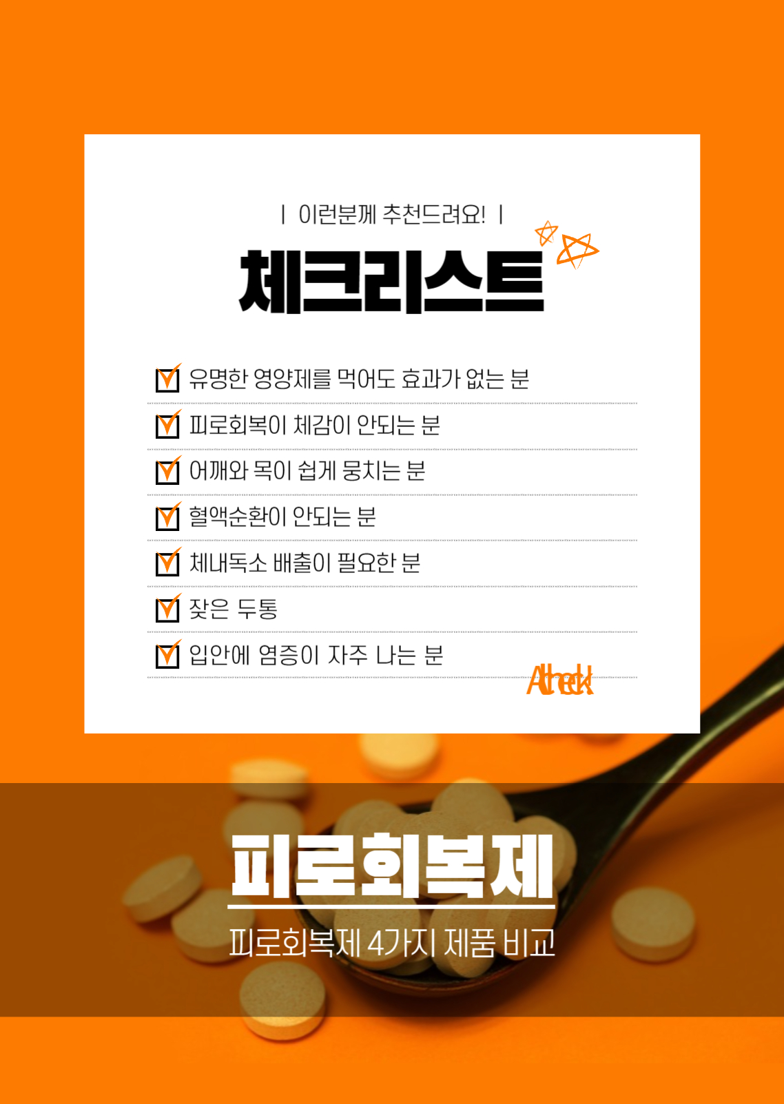 지금까지 피로해소에 필요한 성분(핵심배합)과 인기 있는 피로회복제 4가지 제품을 비교해 보았습니다. 피로가 쌓여 어깨와 목이 쉽게 뭉치고 잦은 두통, 입안 염증뿐만 아니라 나중에는 인지능력저하, 고혈압, 심장질환과 같은 심각한 질환까지도 영향을 미칠 수 있으므로 해당 내용이 도움이 되셨으면 합니다.