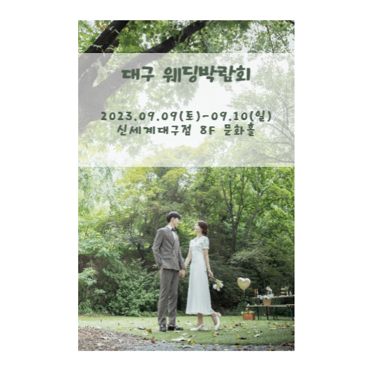 대구 웨딩박람회는 23년 9월 9일(토) - 9월 10일(일) LG BEST SHOP(신세계 대구점) 8층 문화홀(전시 컨벤션)에서 오전 11시부터 오후 7시까지 진행합니다.