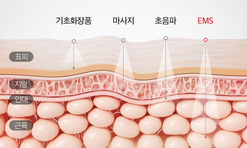 중주파(EMS)는 중주파 에너지를 전달하여 셀룰라이트로 가득한 울퉁불퉁한 피부라인을 개선하고, 속근육까지 자극을 주어 피부라인을 개선합니다.
