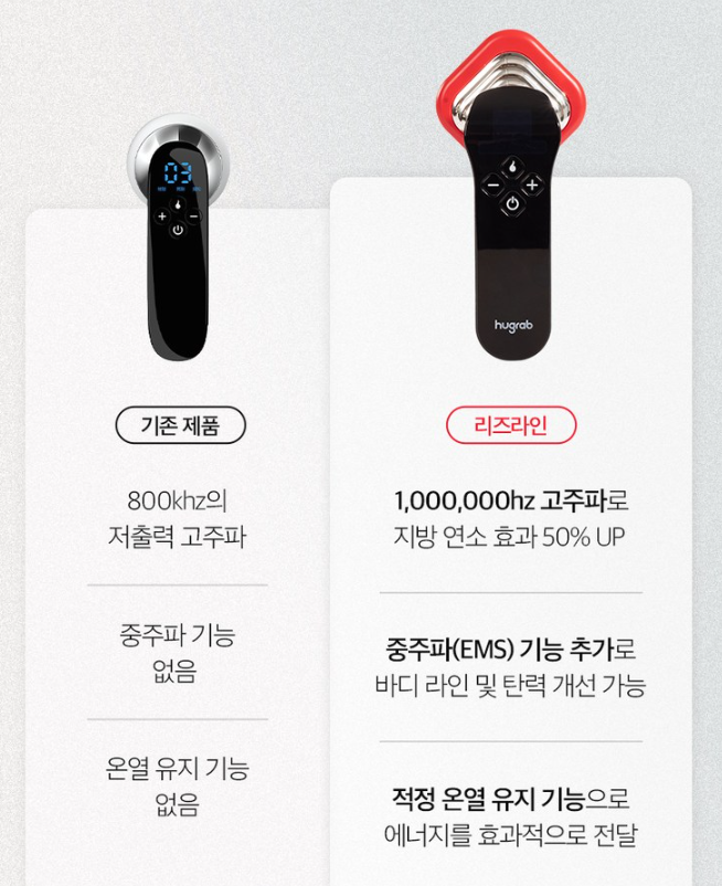 고주파(RF)와 중주파(EMS)를 한 샷에 모두 담은 휴그랩 리즈라인 EMS 고주파 마사지기 터치 한 번으로 피하지방까지 자극하여 보디 라인을 탄탄하게 만들어 볼 수 있습니다. 800khz의 저출력 고주파로 중주파와 온열유지기능이 없던 기존제품과는 달리, 1,000,000hz 고주파로 지방 연소 효과가 50% UP+중주파 기능 추가+적정 온열유지 기능이 추가되었습니다.