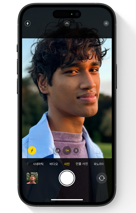 찰나의 순간을 담아야 하는 급박한 순간에 더 이상 인물사진 모드로 일일이 전환하지 않아도 피사체가 사람 혹은 강아지 같은 반려동물인 경우 아이폰 15가 자동으로 심도 정보를 포착합니다. 그래서 촬영 중에 인물사진처럼 흐림 효과가 아름답게 배경에 적용된 상태를 확인하면서 찍을 수 있고, 촬영 후에도 '사진'앱에서 인물사진으로 바꾸는 것도 가능합니다. 또한, 완벽한 인물사진을 만드는 구도의 비밀, 광학 주무급 퀄리티의 2배 망원을 사용해 이동하지 않고도 원하는 앵글의 완벽한 인물사진을 담아낼 수 있습니다.