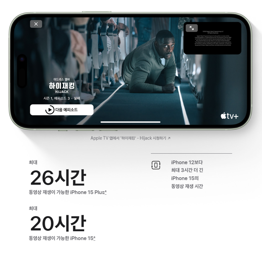 아이폰 12보다 최대 3시간 더 긴 아이폰 15의 동영상 재생시간.