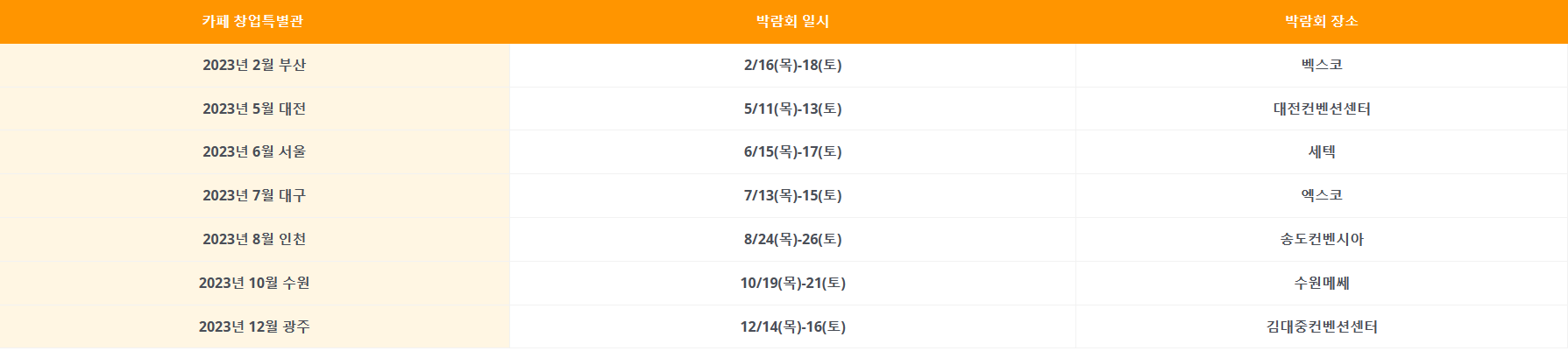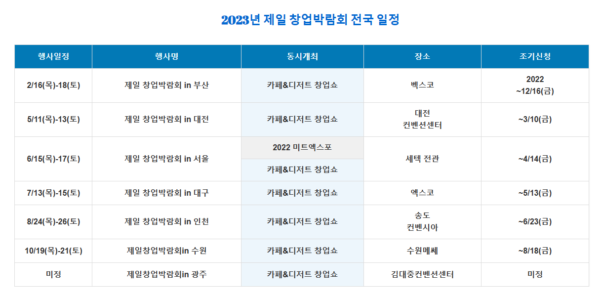 2023년 진행되는 박람회는 서울, 인천, 수원, 대구, 광주, 부산 지역이 준비되어 있습니다. 창업박람회 전시 외 관련된 각종 클래스와 창업세미나, 사업설명회가 지역별로 다양하게 구성되어 있습니다.