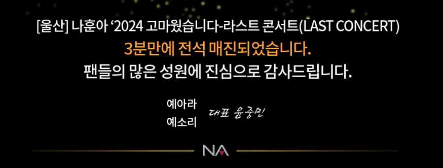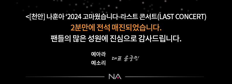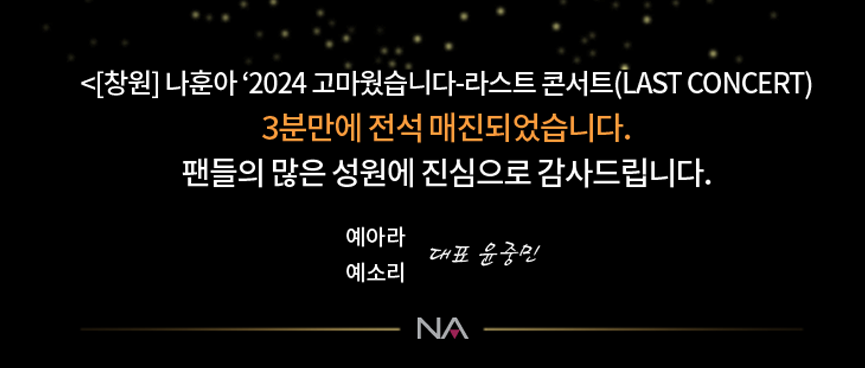 천안에서 진행될 나훈아 '2024 고마웠습니다 - 라스트 콘서트(LAST CONCERT)는 2분 만에 전석 매진되었습니다. 트로트의 황제 가수 나훈아의 많은 팬을 보유하고 있다는 사실을 실감 나게 하는 것 같습니다. 올해까지만 나훈아의 콘서트를 볼 수 있다는 아쉬움도 많이 남는 것 같습니다. 전석 매진 되기 전, 티켓예매 서두르시기 바랍니다.