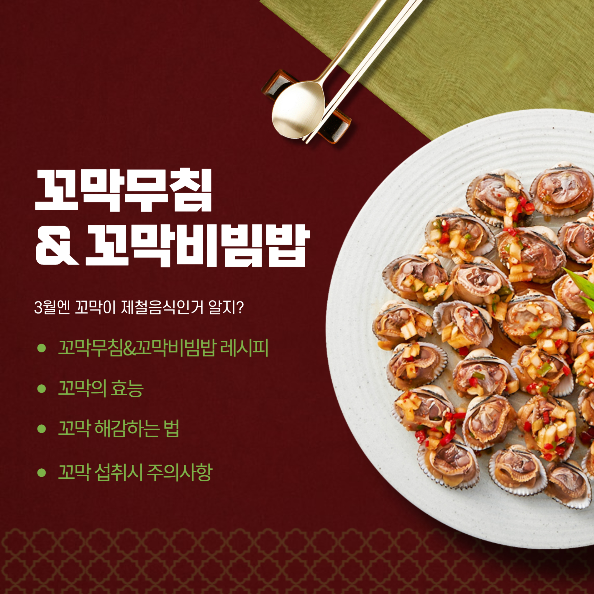 지금까지 3월 제철음식 꼬막에 대해서 알아보았습니다. 꼬막 요리 중 꼬막무침, 꼬막비빔밥, 꼬막양념장과 꼬막 해감하는 법, 꼬막의 효능, 꼬막 섭취 시 주의할 점(부작용)까지 간단하게 알아보았는데요. 면역은 제철에 나는 음식만큼 더 좋은 보약은 없다는 말이 있듯이 건강도 챙기고 맛도 챙기는 3월이 되었으면 좋겠습니다.